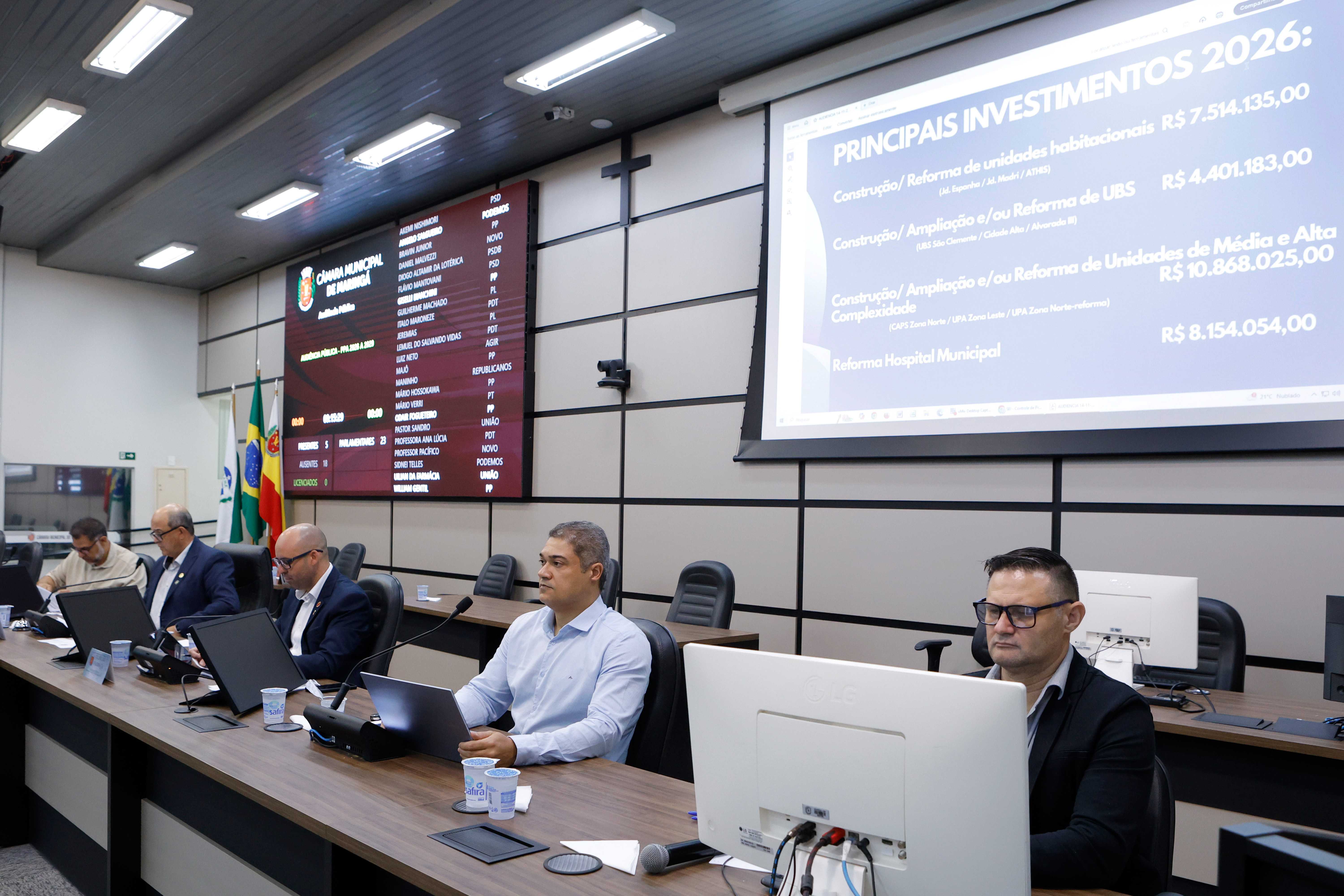 A Comissão de Finanças e Orçamento da Câmara de Maringá apresentou, na manhã desta quinta-feira (14), a previsão orçamentária para 2026, estimada em R$ 3.582.003.907,00, um crescimento de 10,02% em relação ao exercício atual. O evento reuniu vereadores, equipe técnica da Prefeitura e comunidade.
